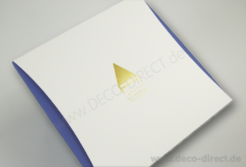 Goldprägung auf Schiebe-Geschenkverpackung (Innenteil blau - Schiebehülle in Bogenform perlweiß).